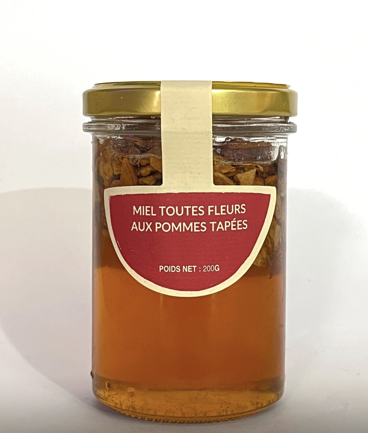 Ce miel toutes fleurs accompagné des pommes tapées est un mélange de saveurs. Il se consomme sur une tartine, en tisane, en plat… Allié de la santé, son utilisation est même conseillé pour vos soigner vos maux de gorges, de sommeil…